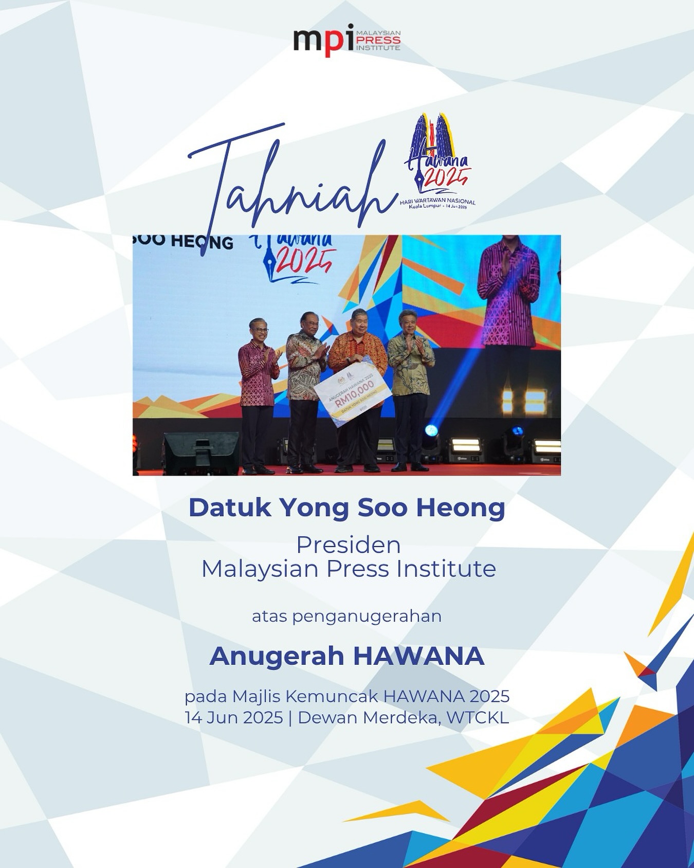 Malaysian Press Institute (MPI) merakamkan setinggi-tinggi penghargaan dan ucapan tahniah kepada Presiden MPI, Datuk Yong Soo Heong atas penganugerahan Anugerah HAWANA sempena Majlis Kemuncak HAWANA 2025 yang berlangsung pada 14 Jun 2025 di Dewan Merdeka, WTCKL.