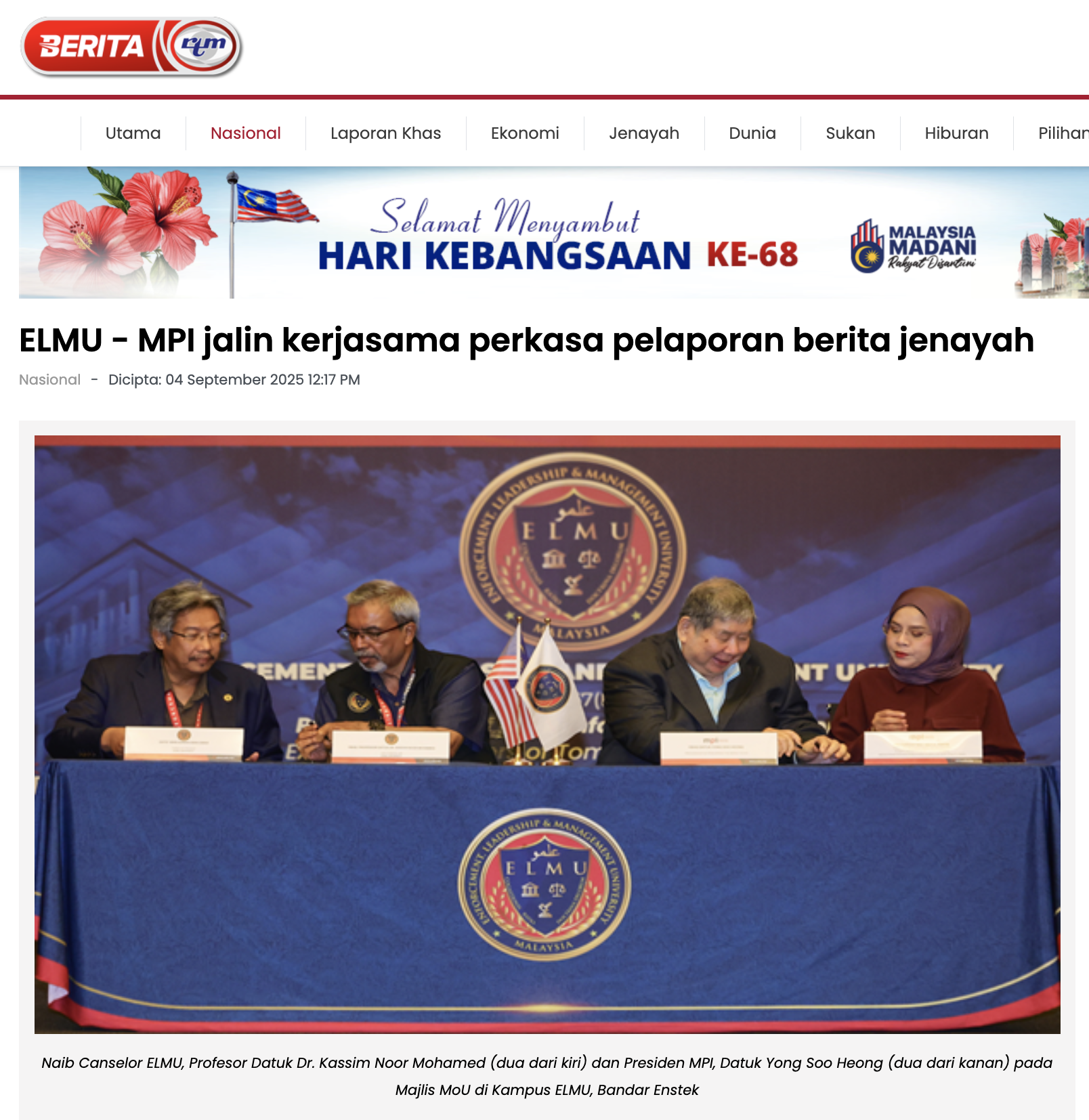https://berita.rtm.gov.my/nasional/senarai-berita-nasional/senarai-artikel/elmu-mpi-jalin-kerjasama-perkasa-pelaporan-berita-jenayah?fbclid=IwY2xjawMmVCNleHRuA2FlbQIxMQBicmlkETE4WGFSU3JVUVFldTA5SkhzAR4BZfslR0ajOVAzPvDW6I4vR8gAXN6zmfIUvpj-kz6q27FvJb_Yy3_mGJcSyw_aem_LmQ9Wrtx2nGHvWU9XplTvw
