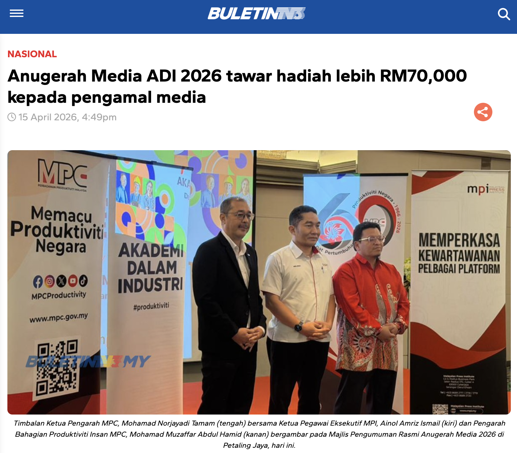 | Sakini Binti Mohd Said | BERNAMA | Penunggang P-hailing perlu patuh garis panduan keselamatan | 3rd RM 1,000.00 |