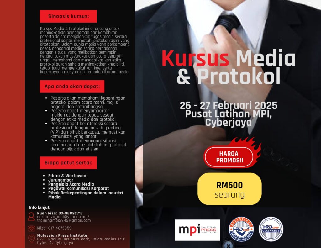 Kursus media dan protokol ini dirancang untuk meningkatkan pemahaman dan kemahiran peserta sambil mematuhi protokol rasmi yang ditetapkan. Dalam dunia media yang berkembang pesat, pengamal media sering berhadapan dengan situasi yang melibatkan pemimpin negara, tokoh masyarakat dan acara berprofil tinggi. Memahami dan mengaplikasikan etika protokol bukan sahaja meningkatkan kredibitili, tetapi juga memperkukuhkan imej serta kepercayaan masyarakat terhadap liputan media.
