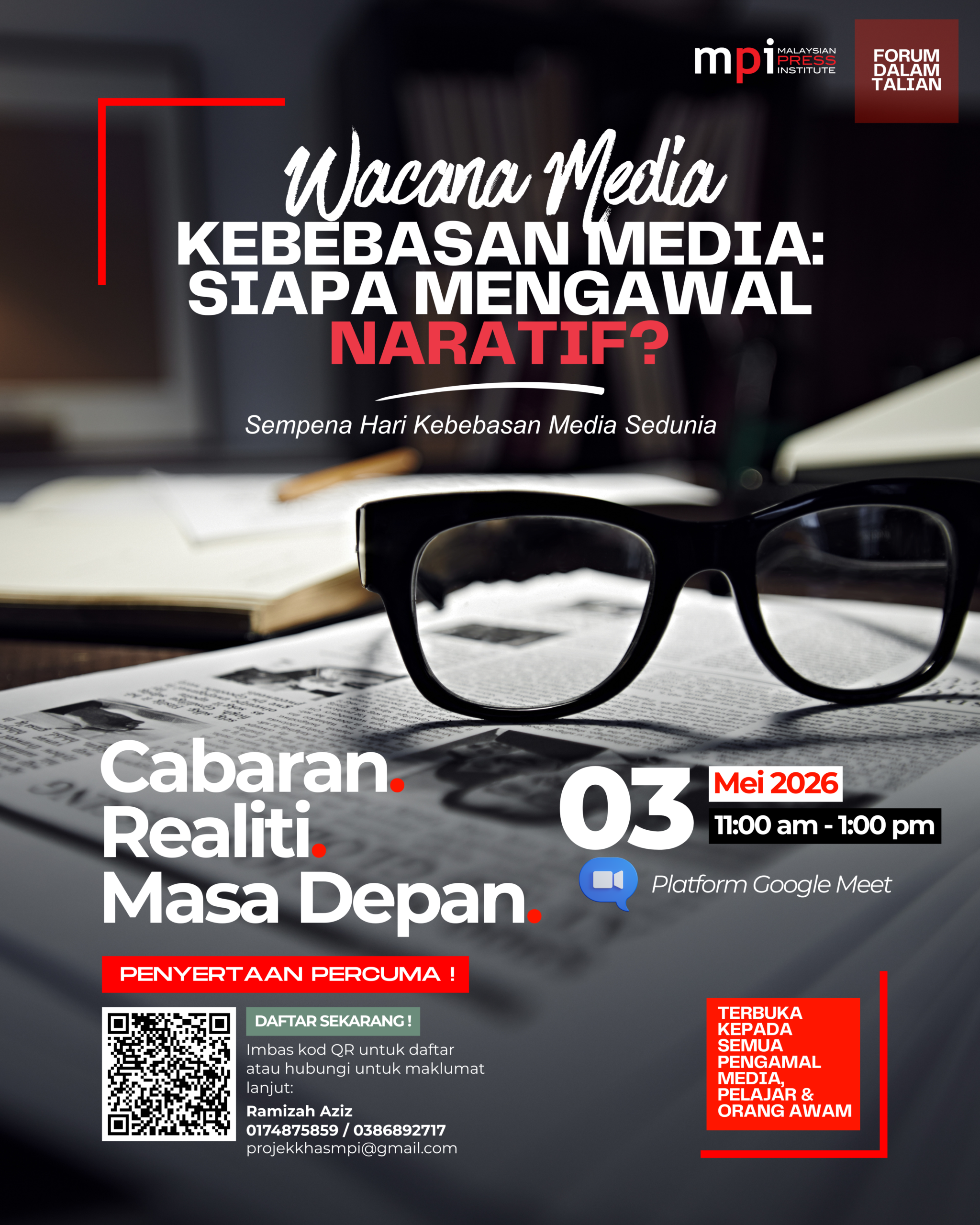 Sempena Hari Kebebasan Media Sedunia, Malaysian Press Institute (MPI) menjemput pengamal media, pelajar serta orang awam untuk menyertai forum dalam talian yang membincangkan isu kebebasan media secara lebih mendalam.