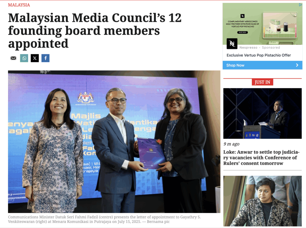 The appointments follow the enforcement of the Malaysian Media Council Act 2025 on June 14, which paved the way for the establishment.